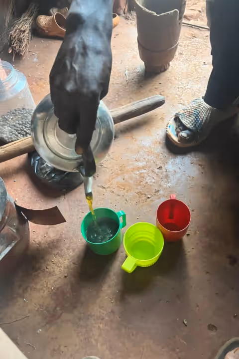 Once the water reached a rolling boil and transformed into a vibrant yellow-green hue, he poured it into a set of mismatched plastic mugs. We sat on the dirt floor, the heat from the mugs warming our hands.